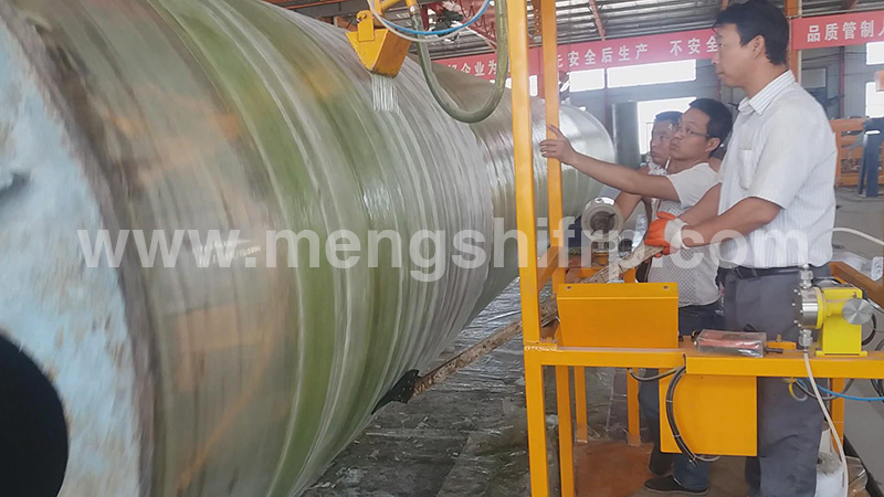 MSFW-3000型玻璃鋼夾砂管道生產(chǎn)線主要裝備:由兩套攪拌罐、制襯機(jī)、夾砂纏繞機(jī)、四套固化站、修整機(jī)、龍門脫模機(jī)、試壓機(jī)等組成,各單機(jī)按生產(chǎn)夾砂管道流水線進(jìn)行布置。
